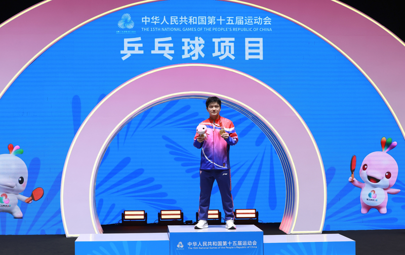 新华社照片,澳门,2025年11月16日\n 11月16日,冠军上海队选手樊振东在颁奖仪式上。\n 当日,在澳门举行的第十五届全国运动会乒乓球男子单打金牌赛中,上海队选手樊振东4比1战胜海南队选手林诗栋,夺得冠军。\n 新华社记者 梁旭 摄